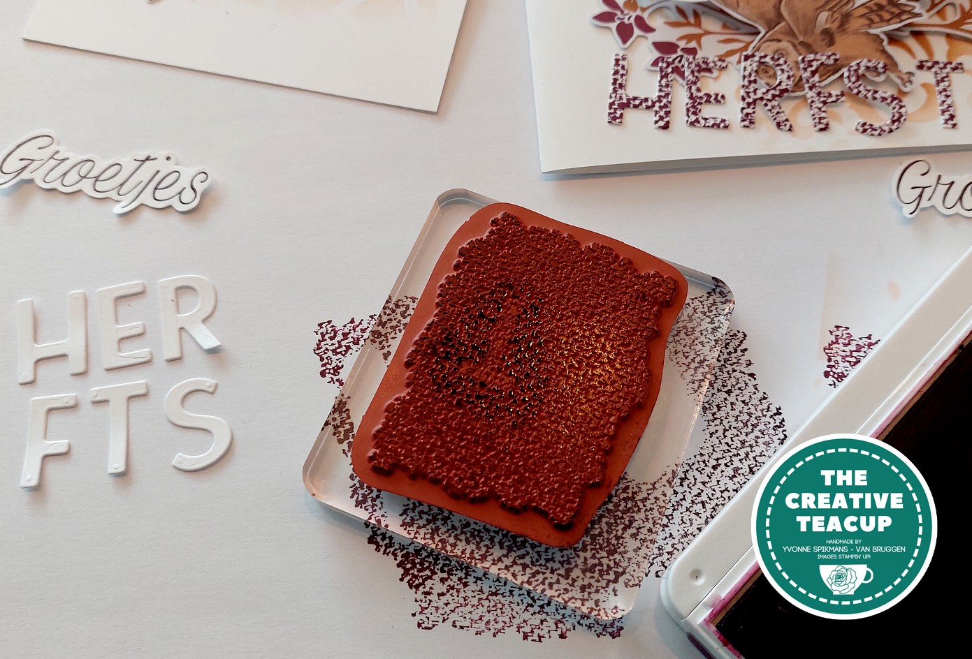 De letters 'herfst' zijn gestanst en daarna met een stempel en inkt van een patroontje voorzien! Helemaal onderaan dit bericht zie je alle benodigdheden. De stempel die ik gebruikte komt uit een host-set, welke je kunt verdienen!