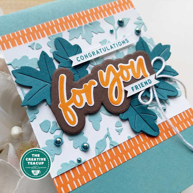 De ondergrond is gemaakt met de Sketched Plaid achtergrondstempel en met de bladeren-mask en embossing-paste, welke gekleurd is met inkt in Lost Lagoon.