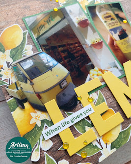 De eerste is een scrap-layout op 30,5x30,5cm met foto's van onze reis naar Rome 2 jaar geleden. Daar vind je diverse winkeltjes met 'alleen maar citroenen'! En natuurlijk: Limoncello!
